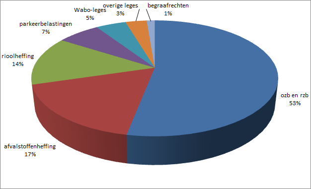 In onderstaande grafiek wordt zichtbaar gemaakt welk aandeel de diverse heffingen hebben in de totale heffingenopbrengst.